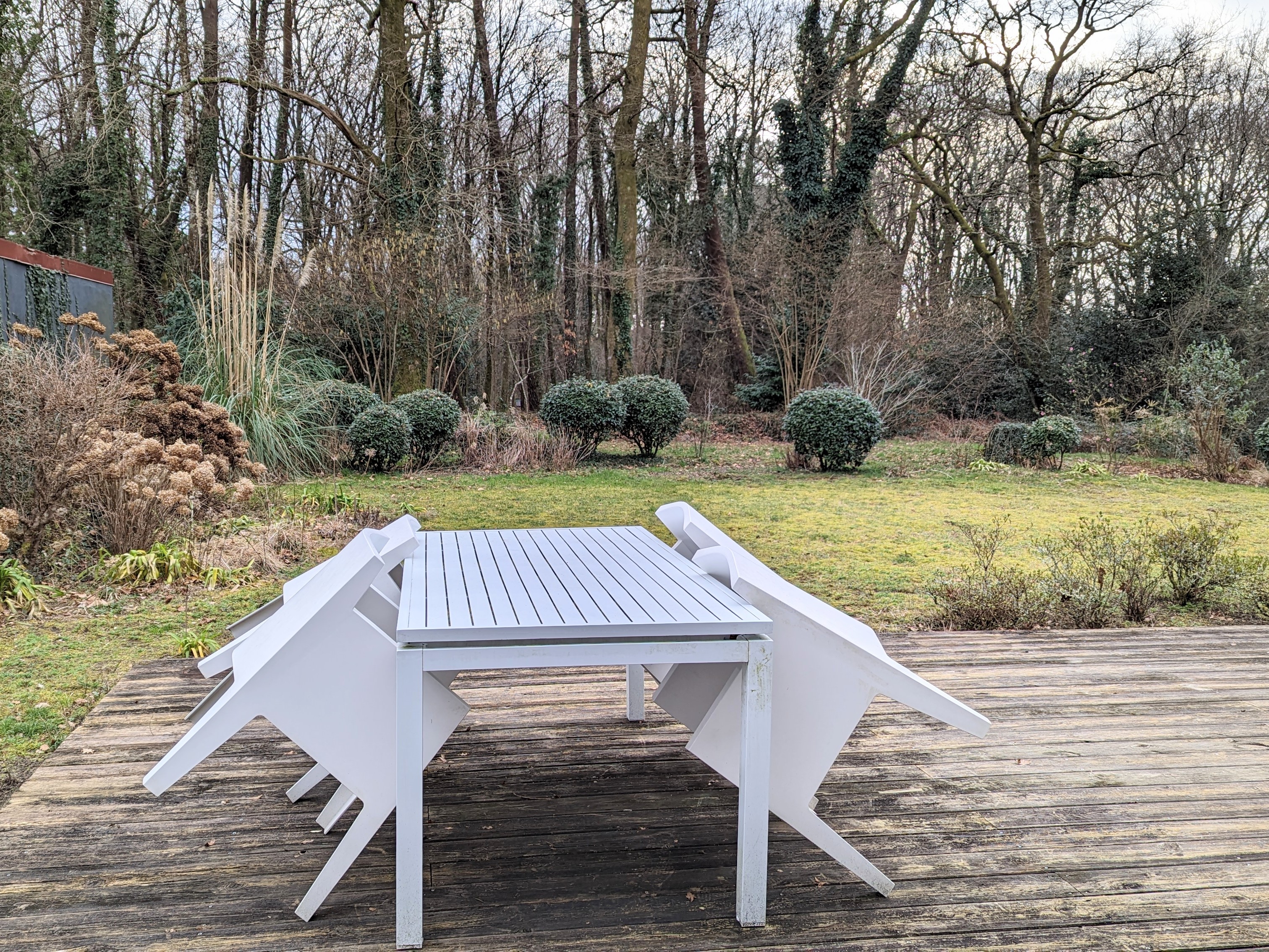 Orientées plein sud, les pièces de vie de la maison s’ouvrent sur une vaste terrasse qui prolonge l’intérieur vers le jardin. Avec le temps, le bois s’est abîmé, les lames ont perdu leur éclat, et cet espace, autrefois central, s’est peu à peu effacé des usages du quotidien.