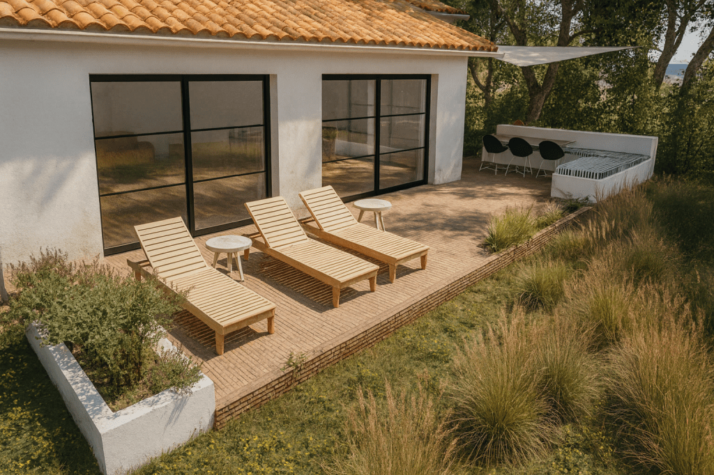 Les propriétaires ont souhaité lui redonner sa place : un lieu chaleureux, vivant, accueillant. Le choix s’est naturellement porté vers une terrasse en pavés de terre cuite. Un matériau noble et pérenne, aux nuances chaudes, qui dialogue avec la lumière du sud et renforce le caractère de la maison.